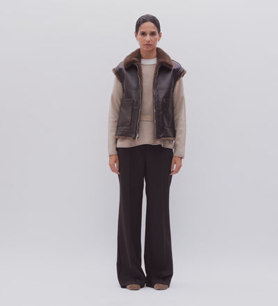 Chaleco corto reversible. Bimateria de piel y pelo vegano. Cuello camisero. Bolsillos en ambos lados: de plastrón en piel y de costura en pelo. Cierre mediante cremallera reversible.